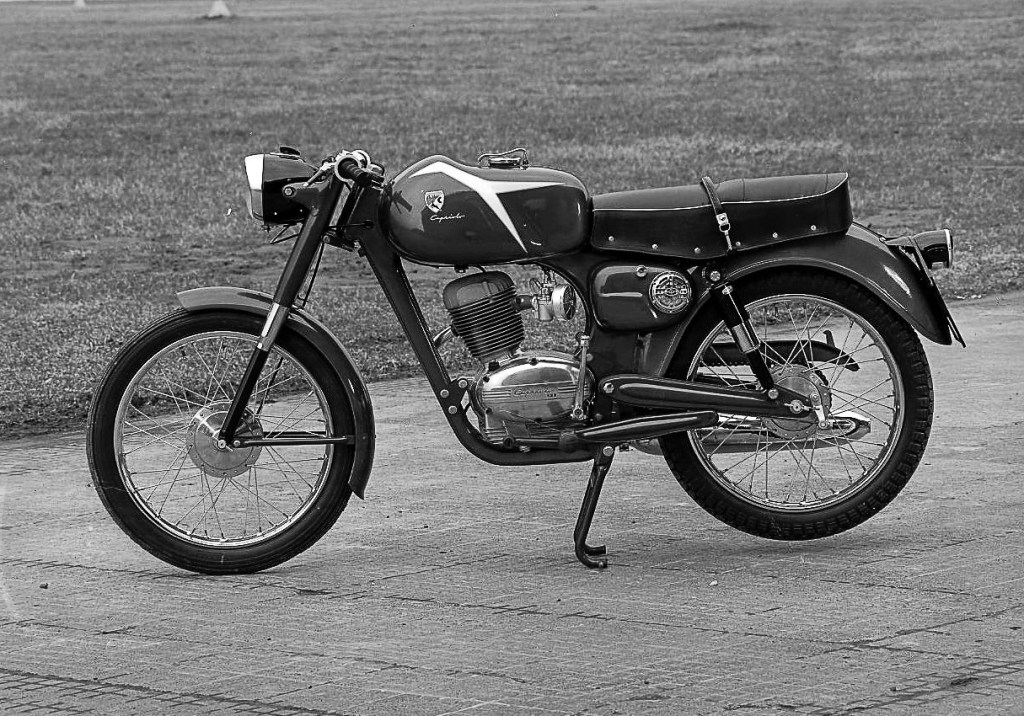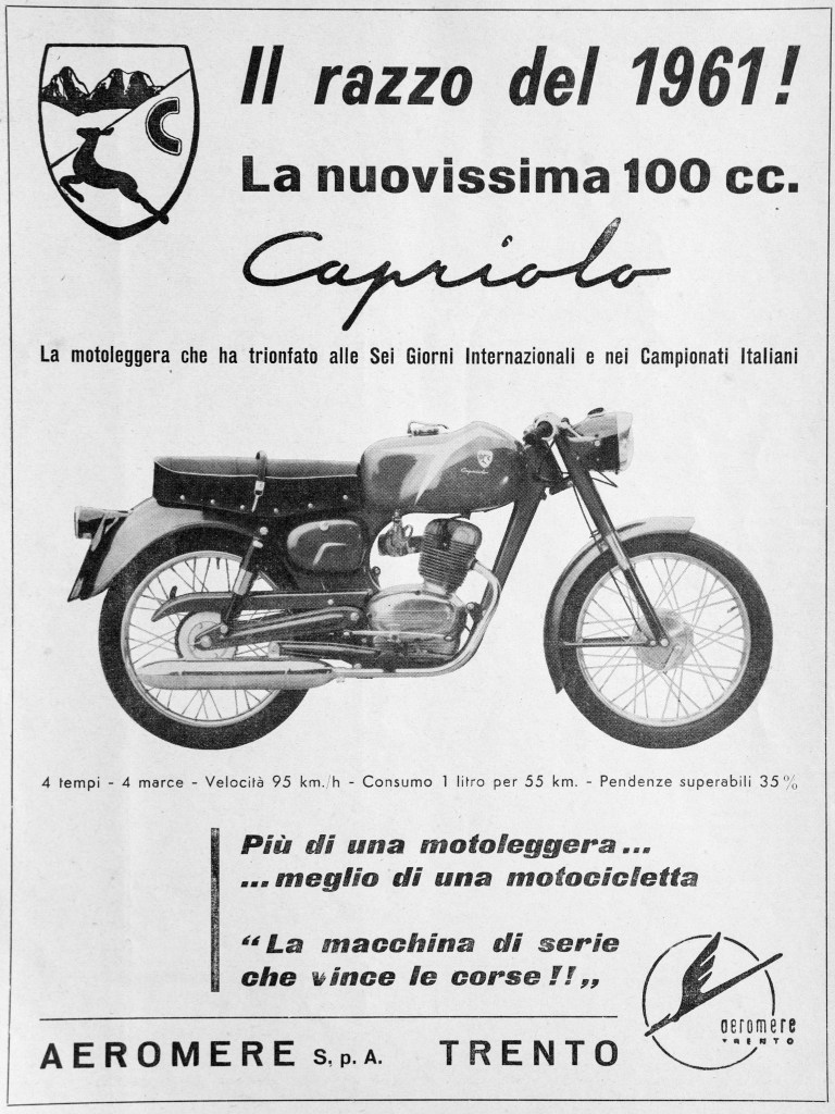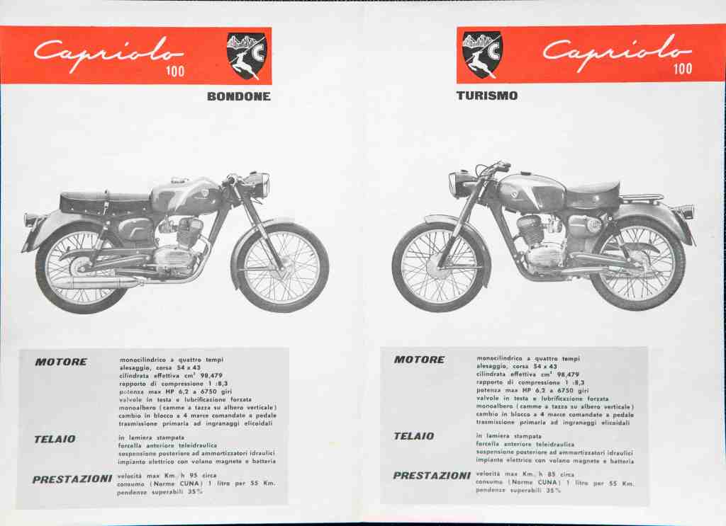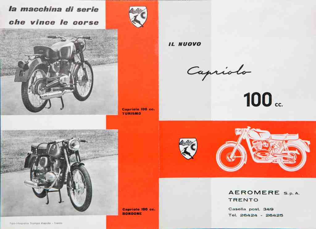 Il Capriolo 100 si inserisce per ultimo (ai primi del 1961) nella produzione motociclistica dell’Aeromere e conserva la tipiche caratteristiche tecniche dei modelli 75 e 125 quali la distribuzione con camma a tazza in testa mossa da albero verticale e coppie coniche. Il modello rappresentato dalla fotografia è denominato “Bondone” (dal nome della montagna, celebre per le competizioni in salita, che sovrasta Trento). E’ stata realizzata anche una serie in versione Turismo.