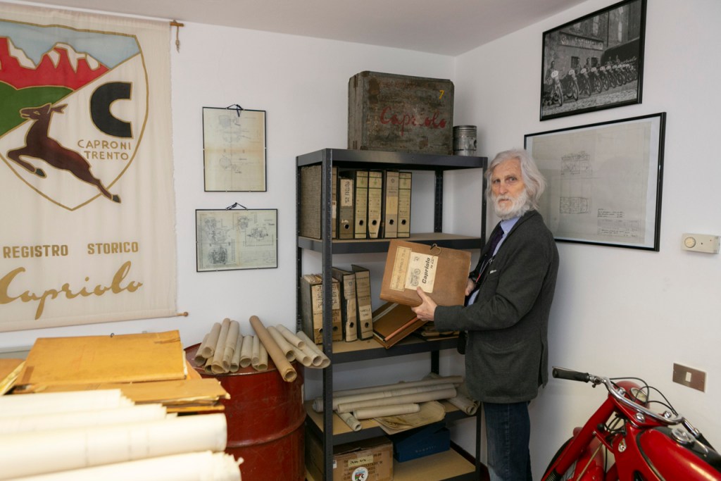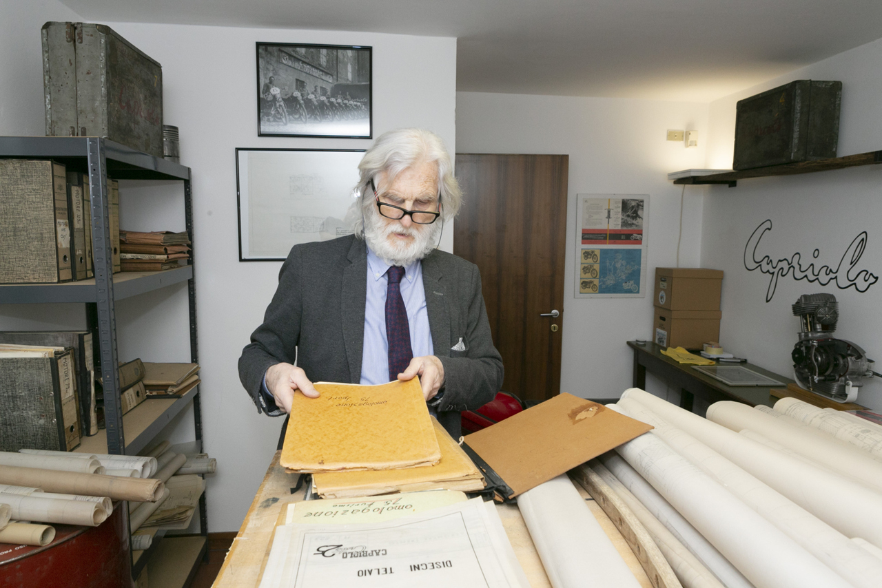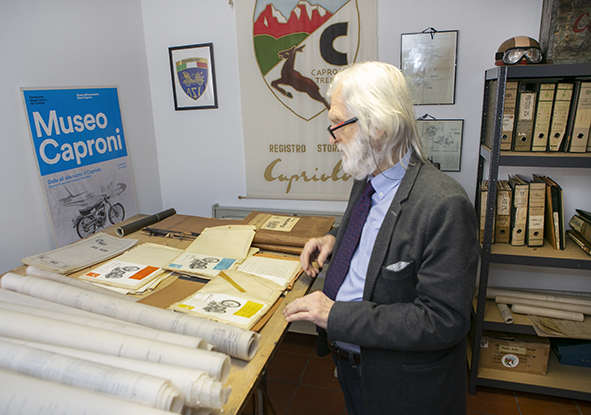Il Presidente Franco Nardelli con la documentazione originale Aero Caproni e Aeromere. Disegni, progetti, dossier e tavole autentiche della moto Capriolo.