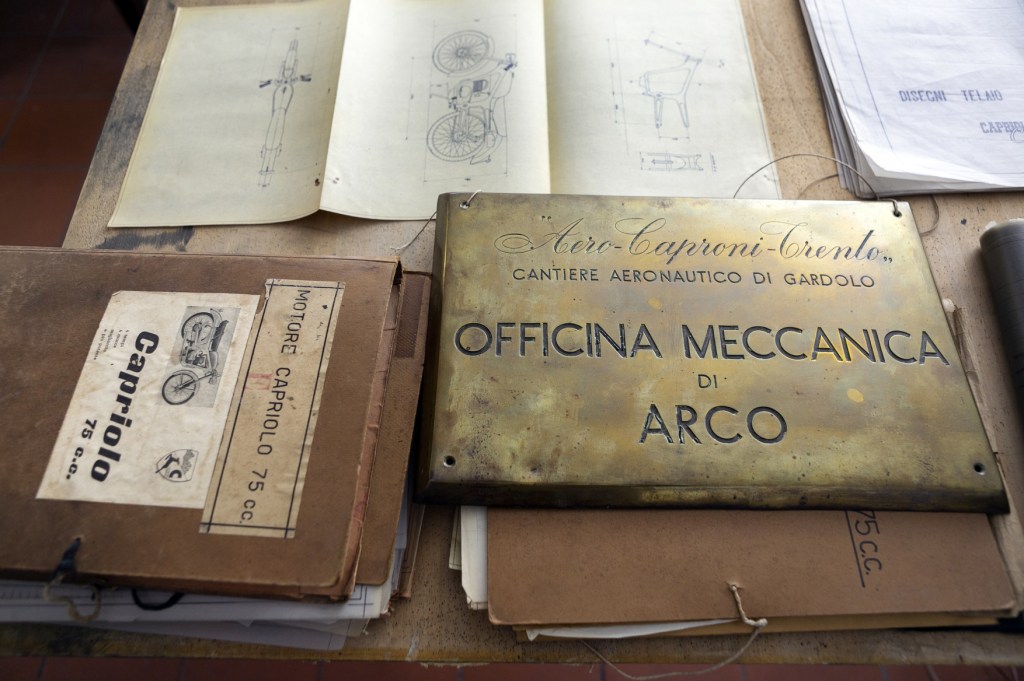 NELLA FOTO: I DOCUMENTI AERO CAPRONI E AEROMERE ACQUISITI E L’INSEGNA ORIGINALE DELLO STABILIMENTO DI ARCO